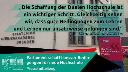 Landesstudierendenvertretung blickt mit gemischten Gefühlen auf Hochschulgesetznovelle Gestern hat der Sächsische Landtag die neue Hochschulgesetznovelle und damit die Gründung einer neuen sächsischen Hochschule beschlossen. Aus der Berufsakademie Sachsen wird jetzt die Duale Hochschule Sachsen. Zugleich hat der Landtag einen neuen Rahmen für krankheitsbedingte Prüfungsunfähigkeit beschlossen und setzte damit eine langjährige Forderung studentischer Interessenvertretungen durch. Die Konferenz Sächsischer Studierendenschaften (KSS) lobtHier weiter lesen…
