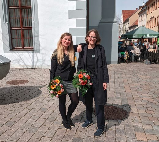 Die beiden Sprecher'innen stehen auf dem Marktplatz von Freiberg mit Blumensträußen in der Hand.