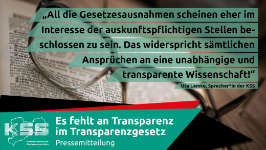 Im Hintergrund ist eine Brille auf einem Buch zu sehen. Im Vordergrund folgendes das Zitat der Sprecher*in der KSS Uta Lemke zu lesen: "All die Gesetzesausnahmen scheinen eher im Interesse der auskunftspflichtigen Stellen beschlossen zu sein. Das widerspricht sämtlichen Ansprüchen an eine unabhängige und transparente Wissenschaft!"