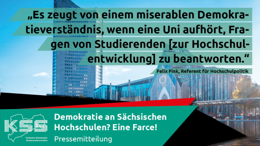Foto des Hauptcampus der Uni Leipzig in leichtem Hochwasser mit dem Text "Es zeugt von einem miserablen Demokratieverständnis, wenn eine Uni aufhört, Fragen von Stuiderenden [zur Hochschulentwicklung] zu beantworten. - Felix Fink, Referent für Hochschulpolitik". Untem im Bild ist ein Banner mit dem Logo der KSS und der Überschrift der Pressemitteilung: "Demokratie an Sächsischen Hochschulen? Eine Farce! - Pressemitteilung".