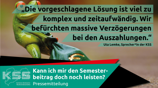 Bild von einer Statue eines Frosches, der einen Geldbeutel zieht. Darüber ein Zitat als Overlay-Text: "Die vorgeschlagene Lösung ist viel zu komplex und zeitaufwändig. Wir befürchten massive Verzögerungen bei den Auszahlungen. - Uta Lemke, Sprecher*in der KSS". Unten ist ein Banner mit dem Titel der Pressemitteilung "Kann ich mir den Semesterbeitrag doch noch leisten?"