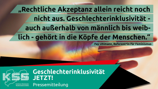 Sachsens Studierendenvertretungen beschließen einstimmig Grundsatzbeschluss zur Geschlechterinklusivität Geschlechter außerhalb des binären Systems wurden in Deutschland im Jahr 2018 offiziell rechtlich anerkannt. Seitdem hat sich jedoch leider wenig in der gelebten Mentalität der Menschen verändert – auch nicht an den Hochschulen. Darauf weist die Konferenz Sächsischer Studierendenschaften (KSS) nun hin und fordert konkrete Nachbesserungen. Bis Mai dieses Jahres hatte Sachsens LandesstudierendenvertretungHier weiter lesen…