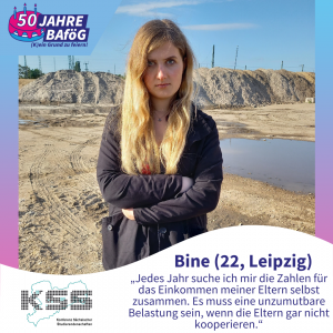 Bine (22) studiert in Leipzig Soziale Arbeit und erklärt: „Jedes Jahr – und seit der Pandemie sogar halbjährig – laufe ich meinen Eltern für ihre Einkommensbelege nach. Da mein Vater in Österreich wohnt und der Kontakt schwierig ist, ist das auch jedes Mal eine nie pünktlich zu bewältigende Herausforderung. Die Konsequenz? Zu jedem neuen Berechnungszeitraum erhalte ich zunächst keine Leistungen bis zur Nachreichung der Unterlagen – und das kann ganz gut mal zwei bis drei Monate lang kein BAföG bedeuten. Das ist keine Sicherheit für ein sorgenfreies Studium – vielmehr fühlt es sich nach Schikane an. Ich kann mir kaum ausmalen welche unzumutbare Belastung es für Studis ist, deren Eltern gar nicht kooperieren.