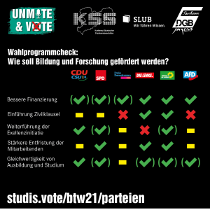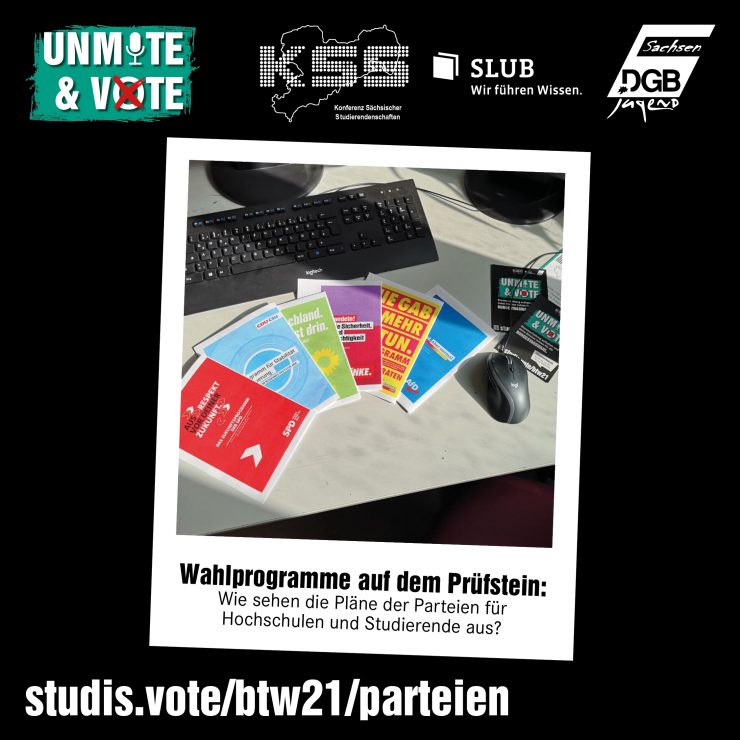 Auch andere Organisationen haben sich mit den Versprechen der Parteien zu hochschulpolitischen Themen beschäftigt. Diese haben wir auf der Unterseite Positionen der Parteien für Euch zusammengestellt. Nutzt ein möglichst breit gefächertes Angebot an Informationen und schaut welche Formate zur inhaltlichen Auseinandersetzung euch am besten gefallen!