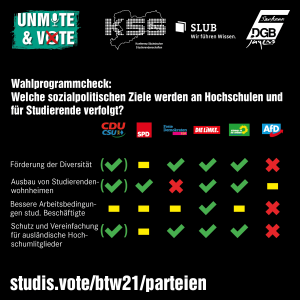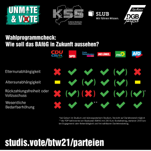 Das Deutsche Studentenwerk hat Wahlprüfsteine erstellt und durch die Parteien beantworten lassen. Dort geht es insbesondere um BAföG, studentisches Wohnen oder die Auswirkungen der Coronapandemie auf das künftige Hochschulsystem. Zu den ausführlichen Antworten der Parteien gelangt ihr auf der Seite des Deutschen Studentenwerkes.