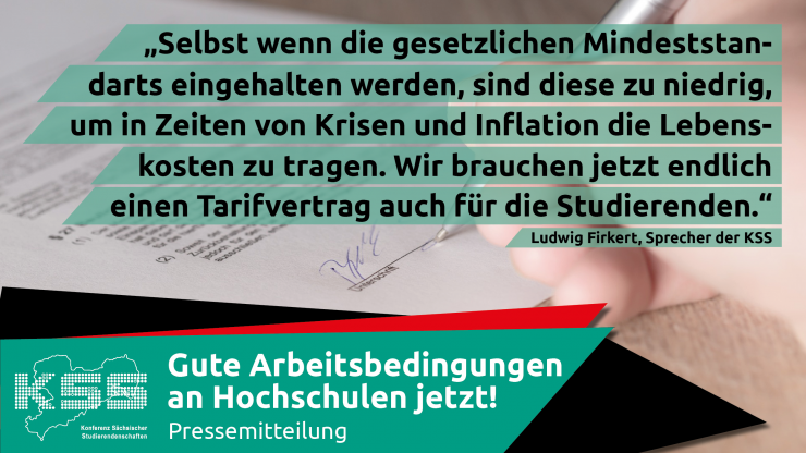 „Selbst wenn die gesetzlichen Mindeststandarts eingehalten werden, sind diese zu niedrig, um in Zeiten von Krisen und Inflation die Lebenskosten zu tragen“, ergänzt Ludwig Firkert, Sprecher der KSS und führt weiter aus: „An sächsischen Hochschulen werden Studierende mit Bachelorabschluss durchschnittlich nur 70 Cent über dem Mindestlohn bezahlt. Der Bachelorabschluss ist somit scheinbar nur 70 Cent in der Stunde wert. Hilfskräfte mit und ohne Bachelorabschluss würden an der Supermarktkasse mehr verdienen – lassen sich aber oft für die Möglichkeit auf eine wissenschaftliche Karriere von den Hochschulen ausbeuten, sofern sie es sich leisten können. Wir brauchen jetzt endlich einen Tarifvertrag auch für diese Beschäftigtengruppe, auch um finanziell schlechter gestellten Studierenden die Chance auf eine solche Stelle zu ermöglichen und um die soziale Auslese zu beenden!“