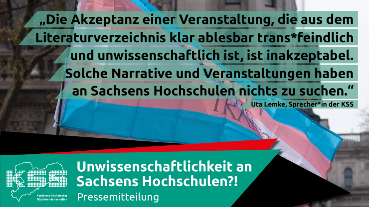 Foto einer wehenden Trans-Pride-Flagge mit folgendem Zitat als Overlay-Text "Die Akzeptanz einer Veranstaltung, die aus dem Literaturverzeichnis klar ablesbar trans*feindlich und unwissenschaftlich ist, ist inakzeptabel. Solche Narrative und Veranstaltungen haben an Sachsens Hochschulen nichts zu suchen. - Uta Lemke, Sprecher:in der KSS". Unten im Bild ist ein Banner mit dem KSS-Logo und dem Titel "Unwissenschaftlichkeit an Sachsens Hochschulen?! - Pressemitteilung"
