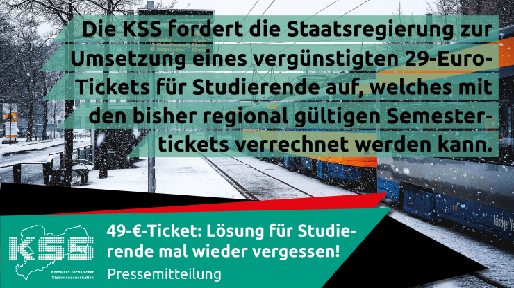 Im Rahmen der Beratungen zwischen Bund und Ländern am 2. November 2022 wurde der Weg für eine Nachfolge des 9-Euro-Tickets frei gemacht. Dieses Ticket soll monatlich 49 Euro kosten, bundesweit gelten und schnellstmöglich eingeführt werden. Für einige bedürftige Gruppen ist in manchen Bundesländern geplant, das Deutschlandticket vergünstigt anzubieten – beispielsweise plant das Land Niedersachsen ein 29-Euro-Ticket für Schüler*innen und Auszubildende. Studierende fanden bislang keine Erwähnung. Die Konferenz Sächsischer Studierendenschaften (KSS) kritisiert, dass keine bundesweit einheitliche Lösung für ein vergünstigtes Bildungsticket gefunden wurde und Studierende erneut komplett vergessen wurden.
