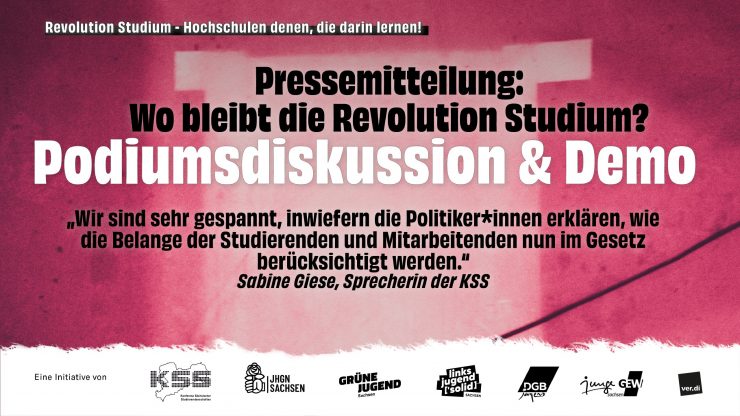 Die Kampagne „Revolution Studium“ hat bereits im Oktober mit vielen Aktionen darauf aufmerksam gemacht, dass die aktuelle Novellierung des Sächsischen Hochschulgesetzes nicht an den Interessen der vom Gesetz direkt Betroffenen vorbei gehen darf. In den nächsten Tagen soll dieses Anliegen nochmals unterstrichen werden. In einer ersten Podiumsdiskussion an der Uni Leipzig haben die vom Gesetz betroffenen Mitgliedergruppen ihre Erwartungen an das neue Gesetz klar formuliert. Nun sollen die zuständigen Politiker*innen Rede und Antwort zu ihren Vorhaben stehen!